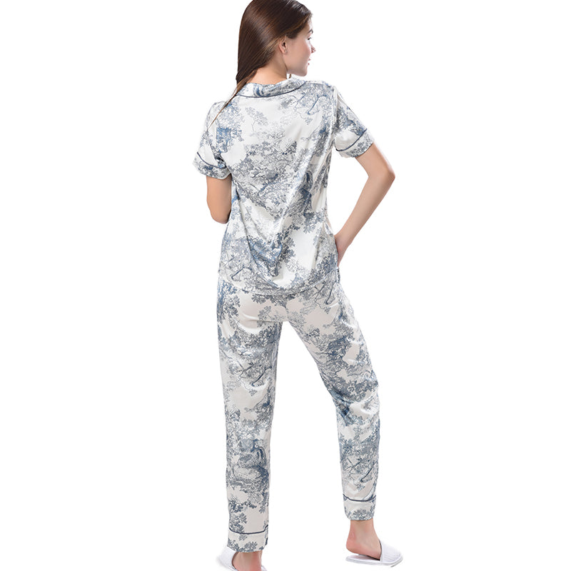 Experience unparalleled relaxation with our Silky Satin Pajama Set, expertly designed to offer both luxury and comfort. The set features a short-sleeve top with a refined notch collar, a buttoned front, and a functional chest pocket for added convenience. The matching pants are equipped with an elastic waistband and side pockets, ensuring a comfortable, adjustable fit for sophisticated lounging and leisure.