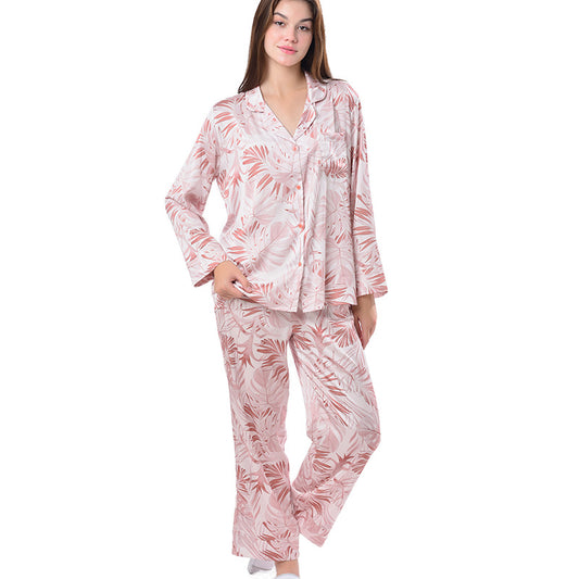 Pajamas Set Long sleeve and Pants Sleepwear Soft and Comfy Button Down Loungewear Relaxed Fit Big Leave Brown